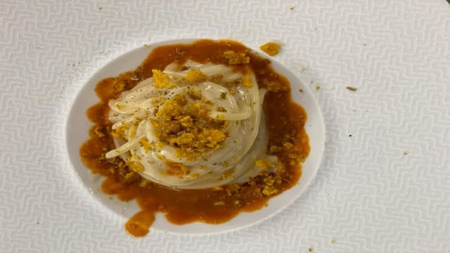 Spaghettone senatore cappelli con polpa di riccio e polvere di pomodoro secco