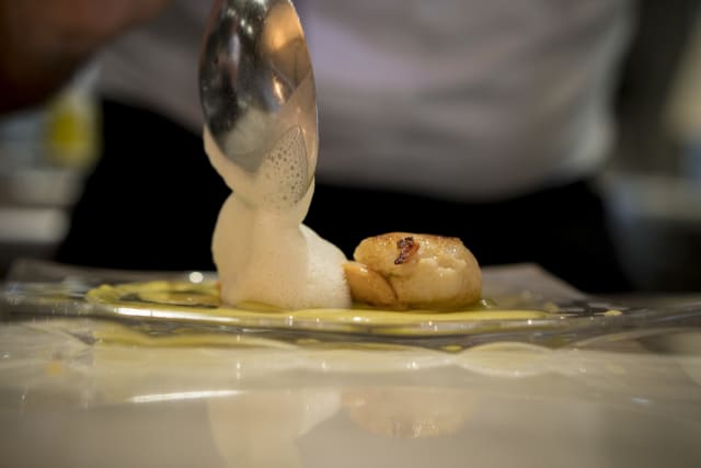 Rodaballo asado con almejas, toques de raifort y salsa láctica al champagne