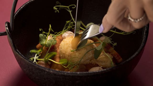 Cochinillo crujiente, acompañado de crema de judías verdes, ruibarbo y mini mazorcas glaseadas en su jugo