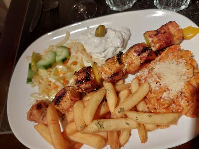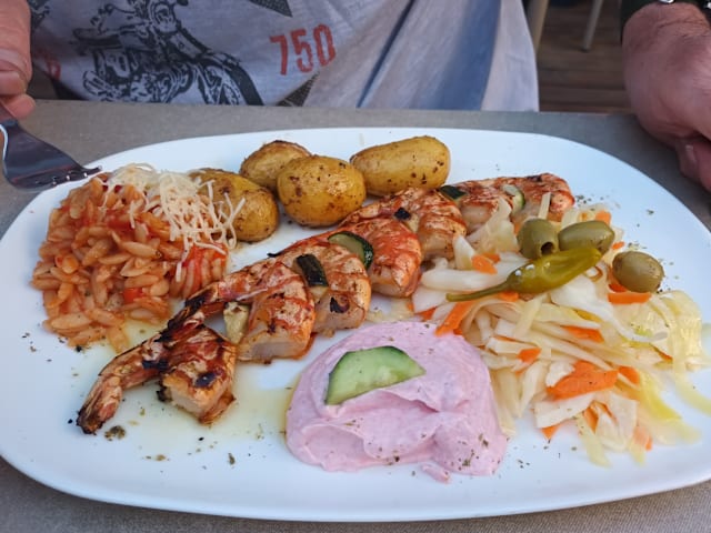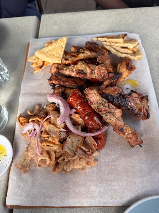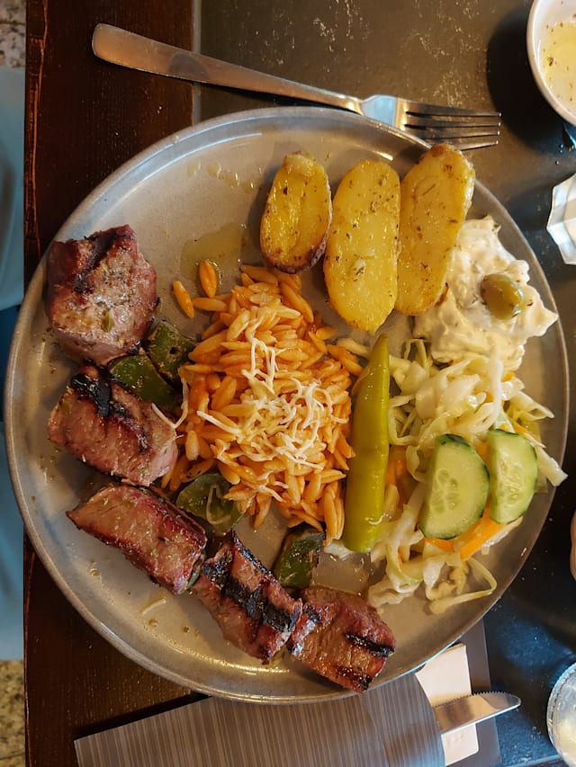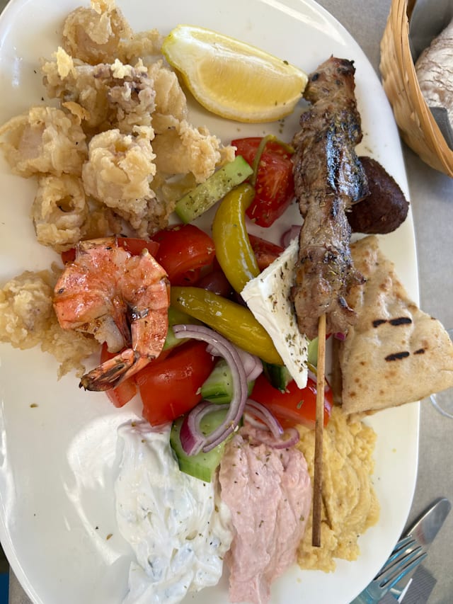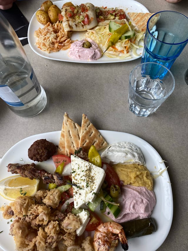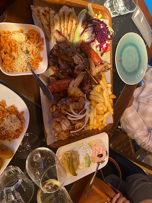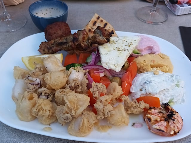 6.5/10We went here to celebrate our anniversary but were honestly disappointed, especially after reading all the positive reviews. First of all the glasses were dirty, because they are stored outside so small dirt piles up. The food is good, but expensive for what you get. Most of the mezze consists of the greek salad (which is cheap to make) and fried octopus, but all of the more special things you get is mostly a singular piece. When my food arrived I was about to eat it but it got taken away again and then my « real » plate was almost thrown on the table which resulted in some of the fried squid just falling on the floor. This is very unprofessional. The waiter was friendly up until our payment went through and then he didn’t even glance at us when we left the restaurant. Unfortunately we won’t be coming back here.