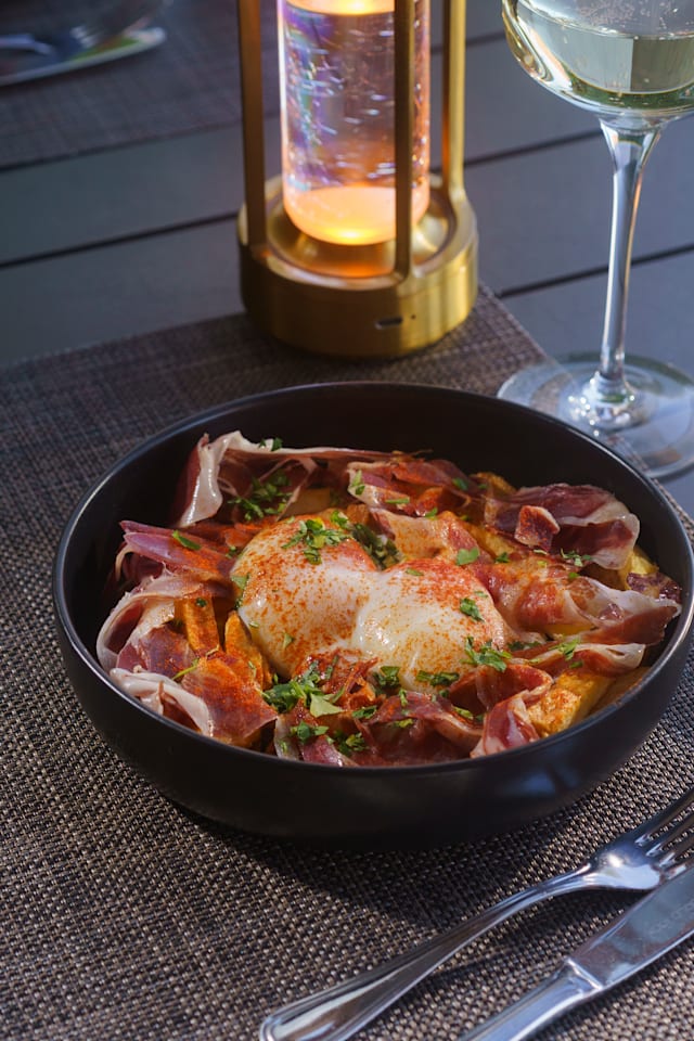 - Broken Eggs with Prosciutto (Homemade Potato Chips, Fried Onions, Sous-Vide Eggs, Iberian Pork Prosciutto and Smoked Paprika)