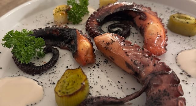 - Polpo con doppia cottura (sottovuoto a bassa temperatura e arrostito) nappato al burro nocciola