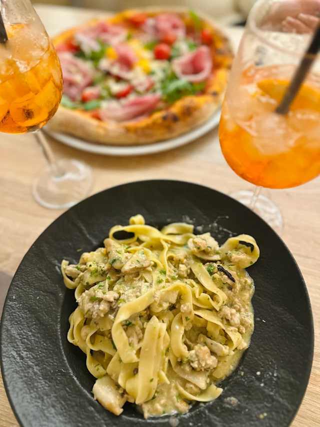 - Salsa di pomodorini confit, mozz. fior di latte, salsiccia fresca, peperoni, rucola. Glassa di aceto balsamico.