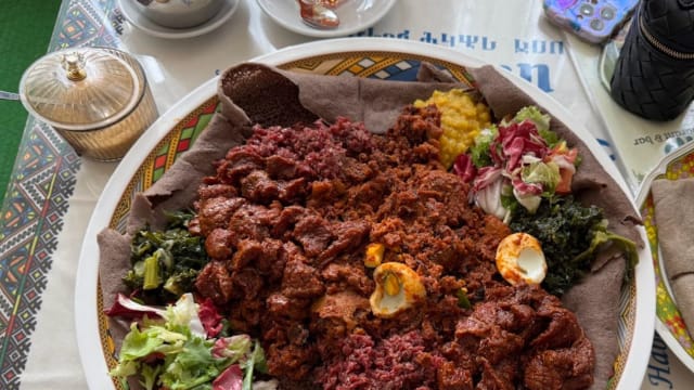 Tartare à l’éthiopienne : viande de bœuf maigre finement haché à la main, assaisonné avec du beurre épicé, du piment rouge et du poivre noir