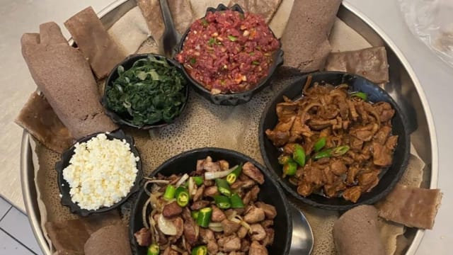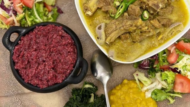 Tartare à l’éthiopienne : viande de bœuf maigre finement haché à la main, assaisonné avec du beurre épicé, du piment rouge et du poivre noir ajout de piment vert et d’oignons