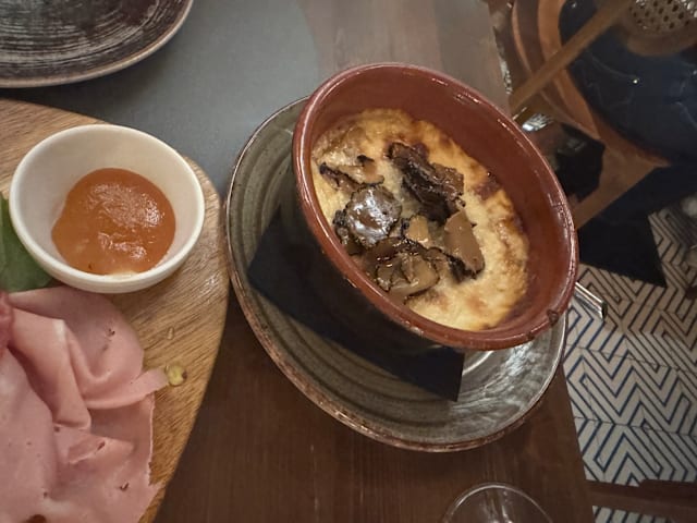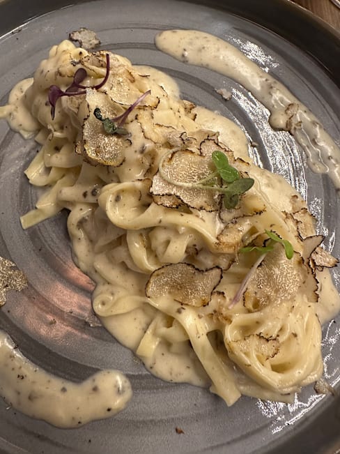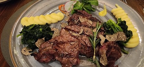 7.5/10Frisian steak very nice served with cold mash potatoes on unwarmed plate . Ordered with truffles but came without so back to the kitchen for an underwhelming amount of bland truffles.. Good bread had to ask for plate and olive oil. House white wine OK. Not in a hurry to return.