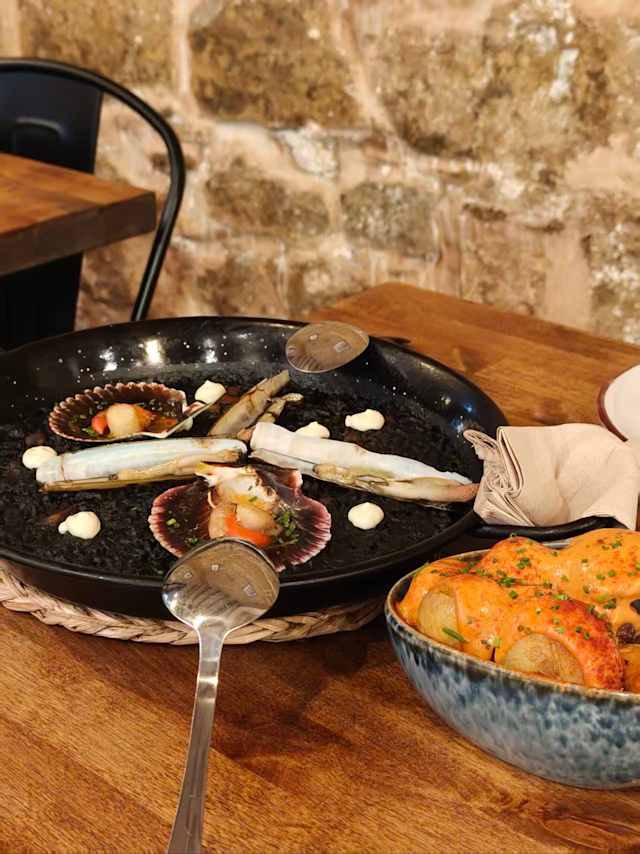 Arroz negro hecho con tinta de calamar, sepia a dados y navajas , acabado con all i Oli