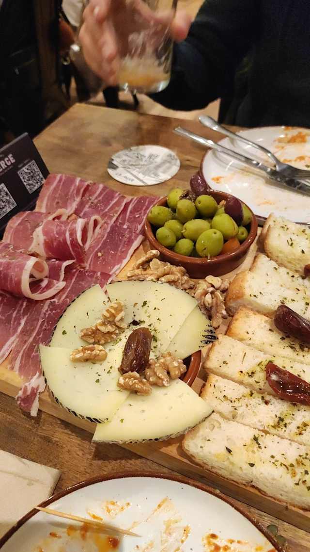 Compuesta de jamón ibérico, queso de oveja marinado en hierbas, confitura de higos, aceitunas aliñadas, bastones de focaccia, frutos secos y tomates semi secos