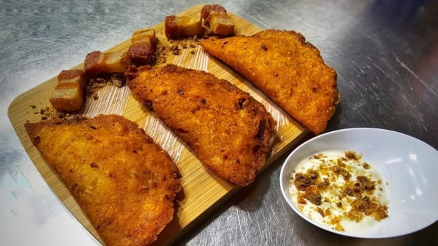 Trio de mini empanaditas de chicharrón, rellenas de queso, acompañadas de torreznos y nata criolla con polvo de chicharrón