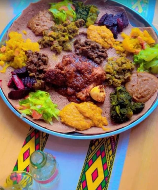 Met ui, tomaat, olijfolie en peper, geserveerd met injera of brood.