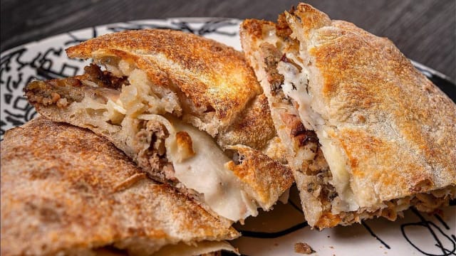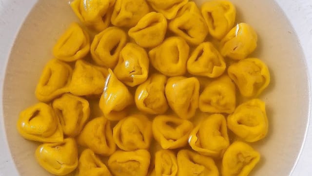 Salsiccia di ripieno di tortellini, friggione, crema di parmigiano, giardiniera e cipolla croccante