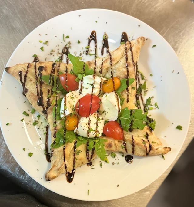 Pomodoro 100% italiano, fiordilatte dell' agro pontino, melanzane a funghetto, scaglie di parmigiano reggiano 24 mesi con emulsione di basilico fresco a crudo