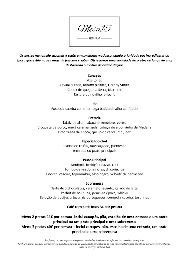 Always outstanding food and service at Mesa 15. We feel spoiled to have such a high quality restaurant in Leiria.