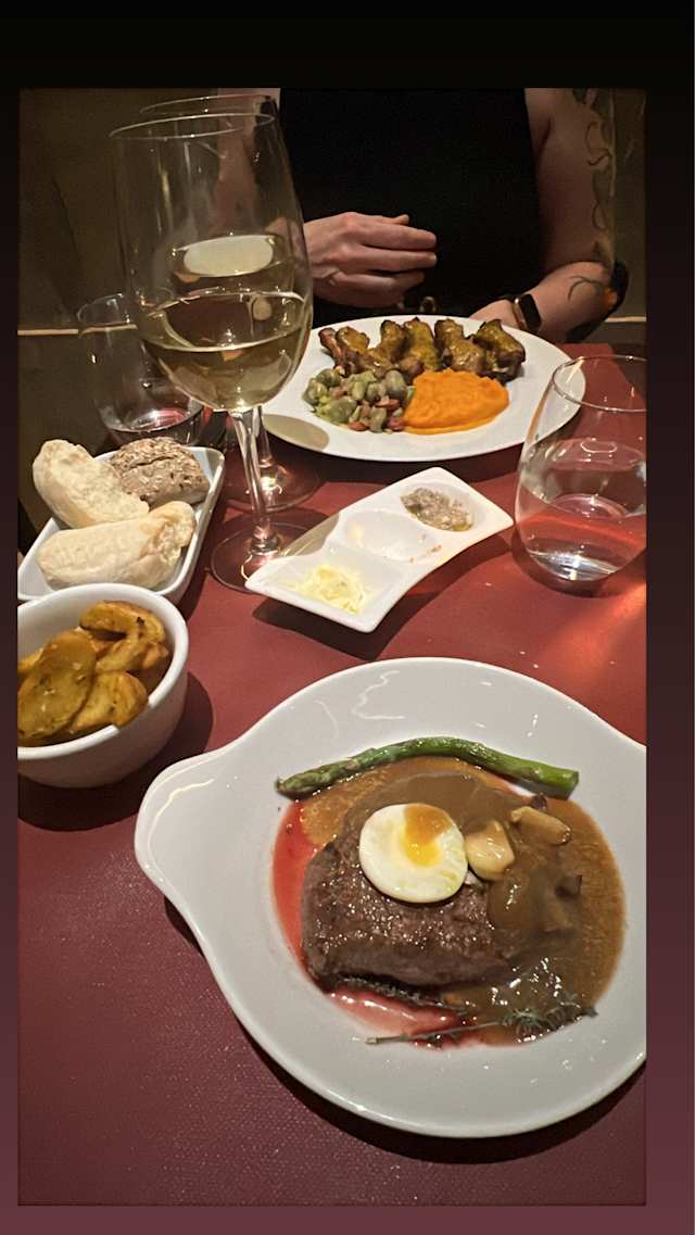 - Bife do lombo acompanhado com batata brava, espargo verde e ovo de codorniz estrelado em molho português ao alho e tomilho