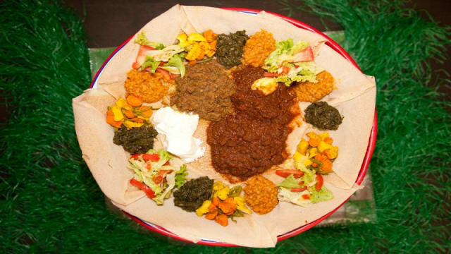 Zigni (Bouchées de Boeufs) et Tibs (Agneau Sauté) et Doro Wet (Poulet Pimente) Servis Avec Lentilles et Légumes