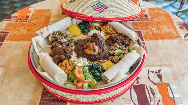 Zigni (Bouchées de Boeufs) et Doro Wet (Poulet Pimenté) Servis Avec Une Garniture Végétarienne