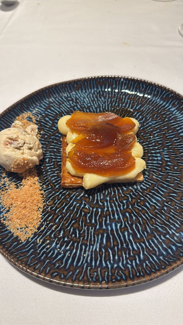 Namelaka Vainilla i Tonka (Financier de avellanas, namelaka de guanaja, ganache montada de vainilla y tonka, frambuesa, streussel de avellanas y albahaca)