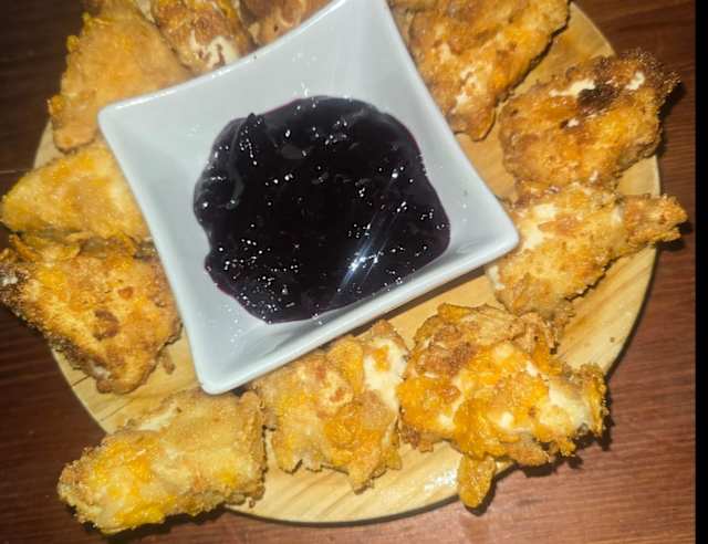 - Buey, queso de cabra, confitura de frambuesa y cebolla frita crujiente