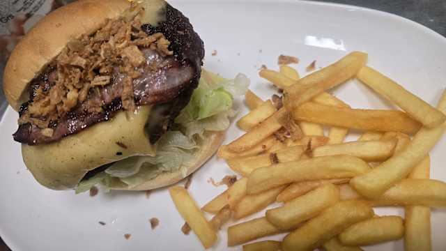 - Con carne madurada de buey, salsa especial de la casa, bacón crujiente, cebolla frita crujienteo caramelizada y lechuga