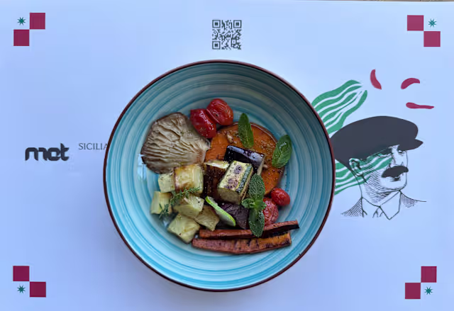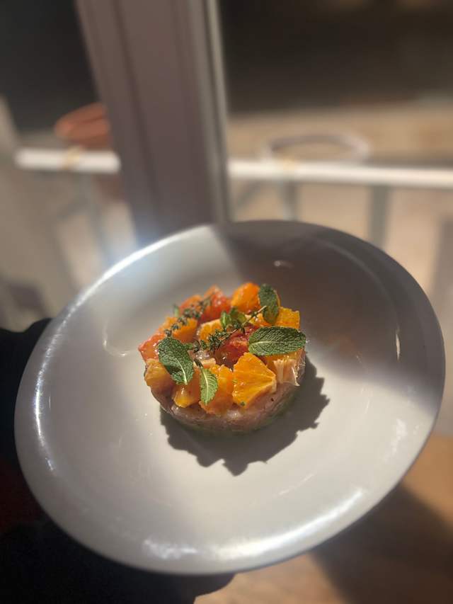 - Pomodoro fresco a pezzetti condito, datterino giallo, tartare di tonno, grana, granella di pistacchio, rucola, menta, olio e.v.o., origano.