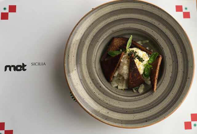 - Pomodoro fresco a pezzetti condito, pesce spada, melanzane, menta fresca, olio e.v.o.
