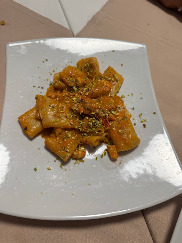 (gambero rosso, pomodorini, pistacchio di Bronte)