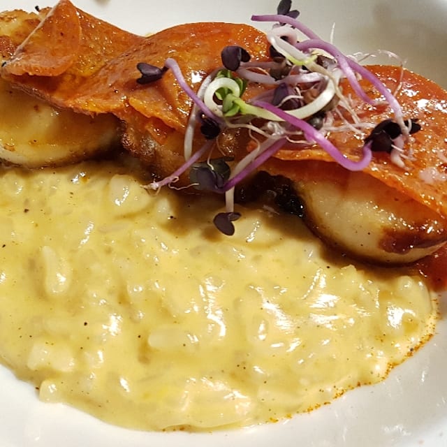 Risotto et filet de cabillaud acidulé aux tomates provençale et lamelles d'ananas