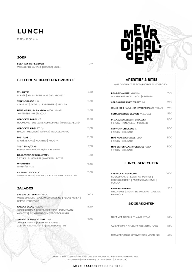 Mevr. Daalder is een sfeervol en gastvrij eetcafé waar iedereen zich thuisvoelt. Wij staan voor smakelijke gerechten, lekkere wijnen en huiselijke warmte zonder poespas. Wij geloven dat lekker, voedzaam en verantwoord perfect samengaan! Wij ...