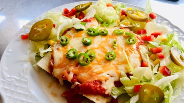Cocinado con pimientos y cebolla. Llene su propia tortilla a su elección. Todo servido con frijoles fritos, guacamole, nata agria, salsa