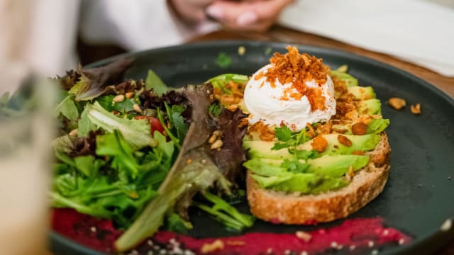Torrada com abacate, molho de tahini, ovos escalfados, grão de bico crocante, coentros, cebola crocante e salada verde