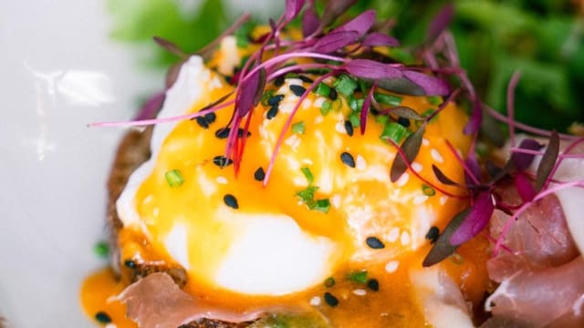 Torrada com aspargos grelhados e presunto, ovo benedict, pistachio e salada de rúcula