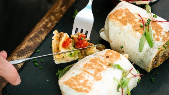 Corn tortilla, black beans, mango, avocado, purple cabbage and vegan yogurt sauce