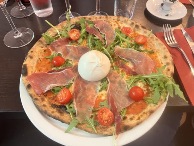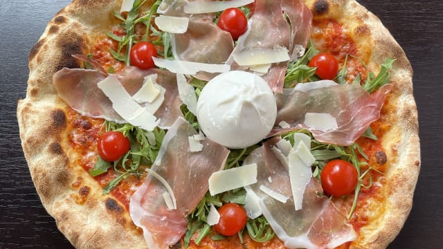 Sauce tomate, mozzarella fior di latte, roquette, tranches de speck IGP., burrata 125 gr., tomates cerises, copeaux de parmigiano reggiano DOP.