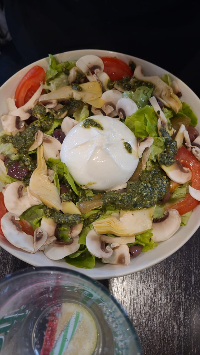 Sauce tomate, mozzarella fior di latte, champignons de paris, artichauts marinés, olives noires, oignons confits, poivrons, roquette, pesto verde du chef et tomates cerises