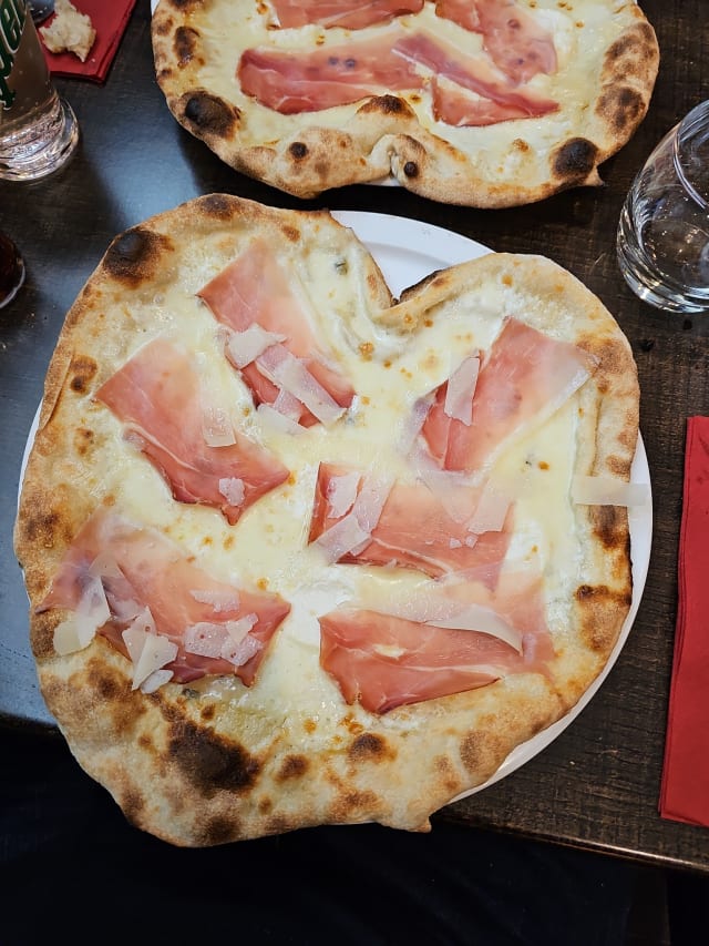 Sauce tomate, mozzarella fior di latte, gorgonzola DOP., chèvre, copeaux de parmigiano reggiano DOP