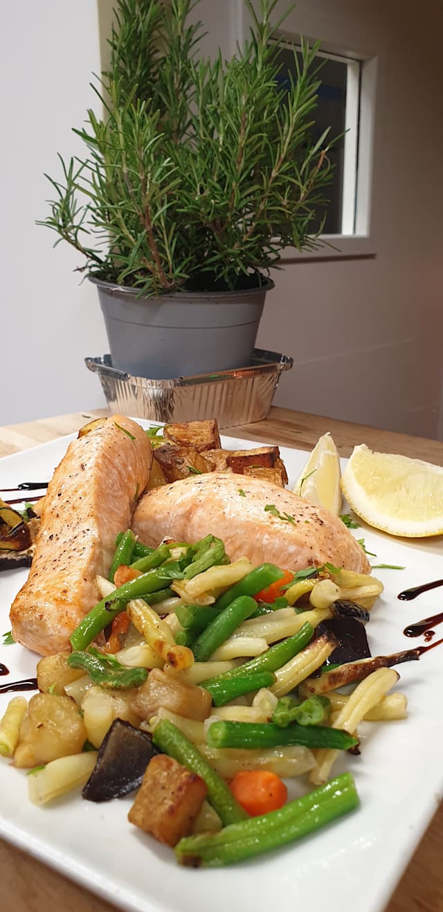Saumon grillé avec pommes de terre, mesclun et sauce citron