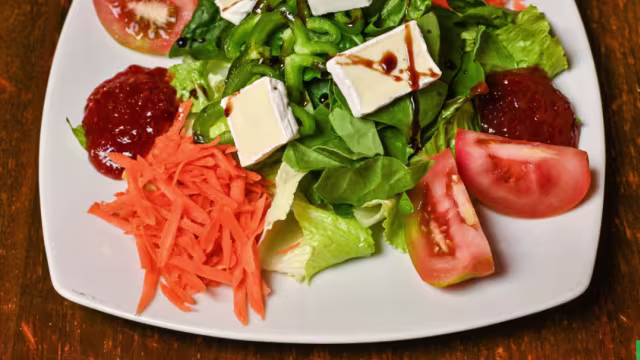 - Mezclum de lechugas, rúcula, queso tête de moine, manzana, tomate, nueces y mermelada de cebolla