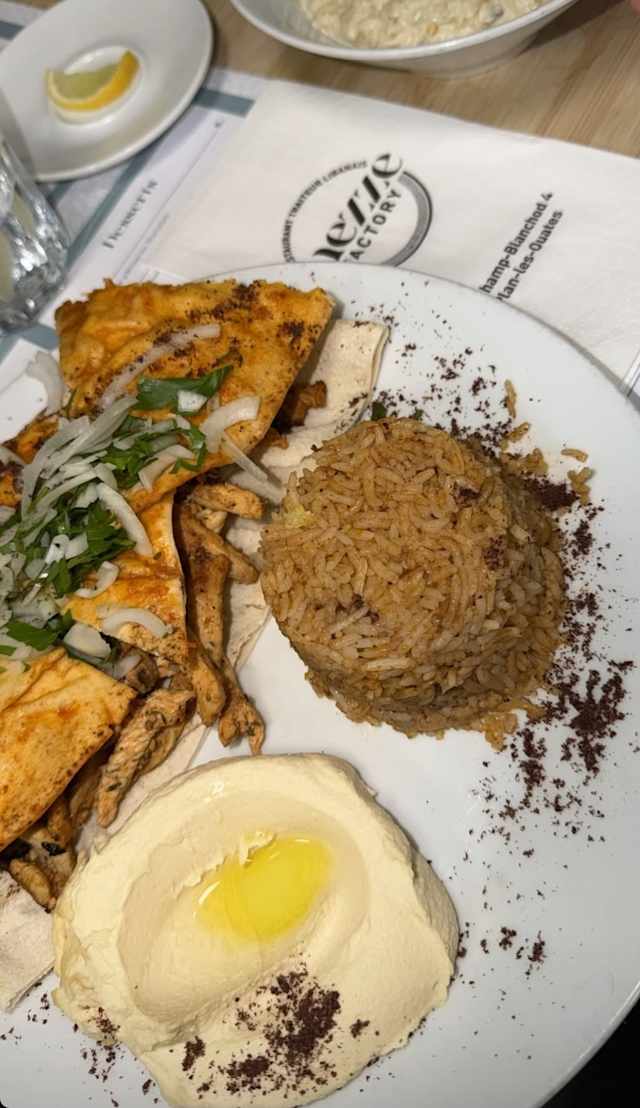 - Emincé de poulet mariné aux épices libanaises, hommous, riz