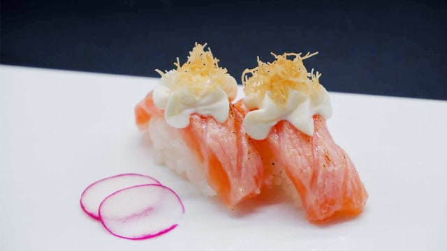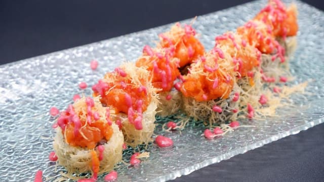 Tartare di riso e salmone ricoperto di kataifi, tobiko, maionese e teriyaki