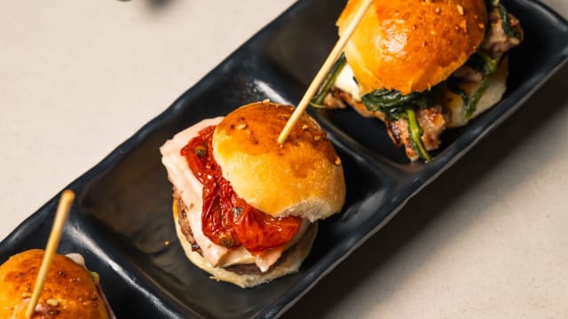 Hamburger irlandese 140gr, prosciutto crudo parma 24 mesi, chips di patate, pesto di pistacchio, pomodorino datterino giallo