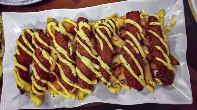 (Tiras de pollo crujientes acompañadas de patatas bañadas en salsa pirata)