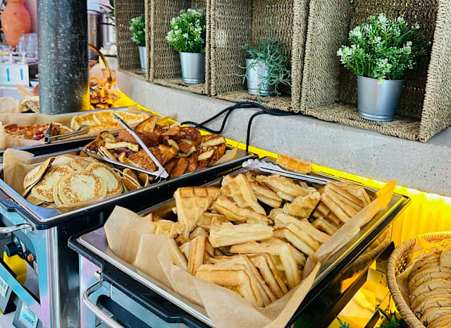 - Pancake / crêpe / brioche perdues / omelettes / oeuf brouillé / saucisses/bacon grillé/ tartes & gâteaux / cake / viennoiserie / flan vanille / riz à la crème / plateaux de charcuteries / fromages / muffins / gaufres / donuts / salades de fruits frais / compotes / fromage blanc...