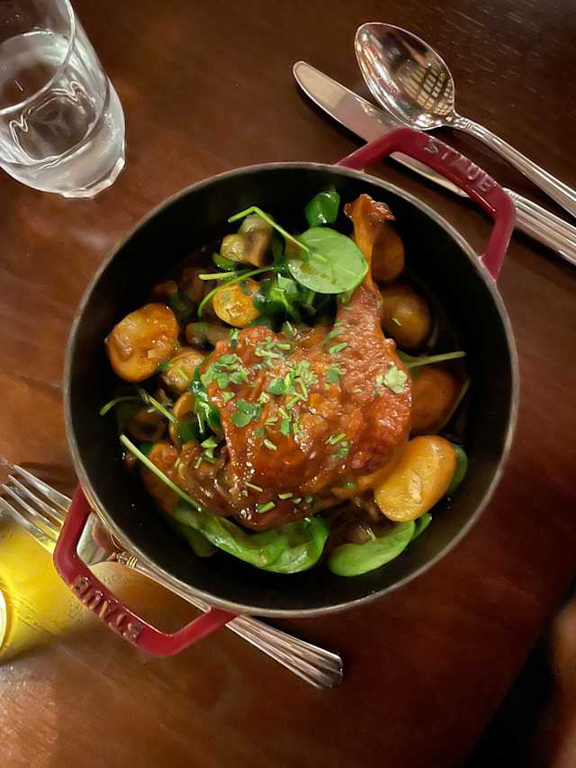 - Œuf coulant & sauce vin rouge avec champignons & pancetta