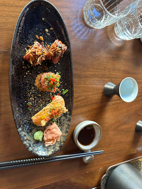 8/10The edamame was delicious and a huge bowl of it!! We had 4X this.. (my son loves it!!) and the crispy fried chicken appetizer was also a favorite (we got it 2x!) and the fat belly tuna and salmon nigiri was delicious… the wagyu beef gyoza was also great! We were a bit disappointed that they didn’t have the wine we selected nor the chicken dumplings anymore on the menu, but these things happen. The inside as recent renovated to be more “upscale” which doesn’t at all match the exterior so it felt fancy inside while we simply wanted relaxed. Overall we enjoyed and will return for sure.