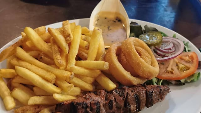 A delicious plant based burger patty, topped with onions, tomato, pickles and Irish tomato relish. Served with onion rings, chips & coleslaw.