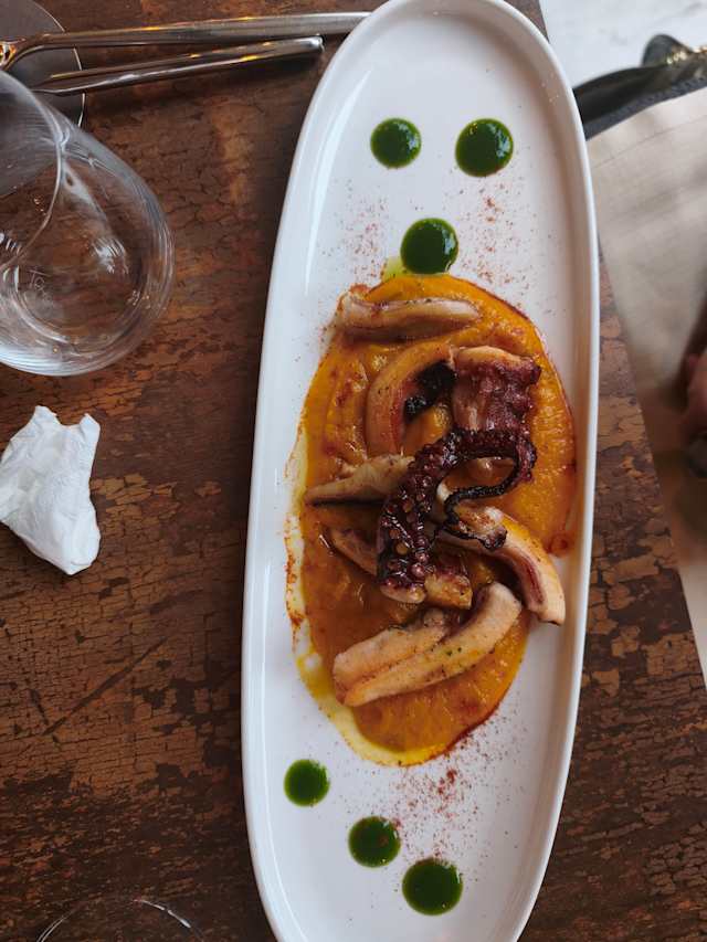 - Polpo rosticciato su crema di zucca speziata e semi di zucca