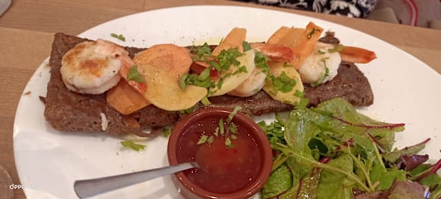 5.5/10Both my husband and granddaughter had the galettes with prawns. The prawns were mushy - really did not taste fresh at all. I had the goat cheese galette and it was fine. I wouldn't go back though.