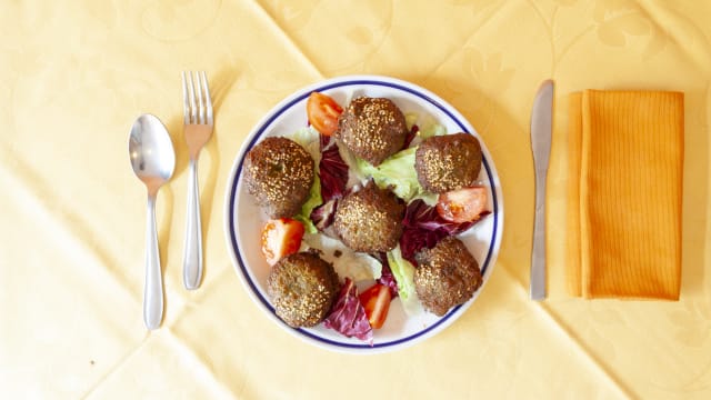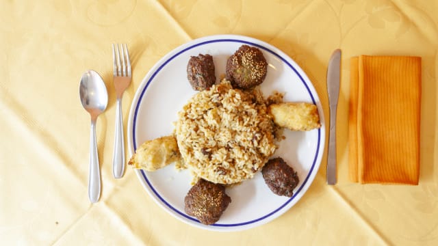 riso con pistacchi, uvetta, mandorla, zafferano e pinoli con mix di polpette