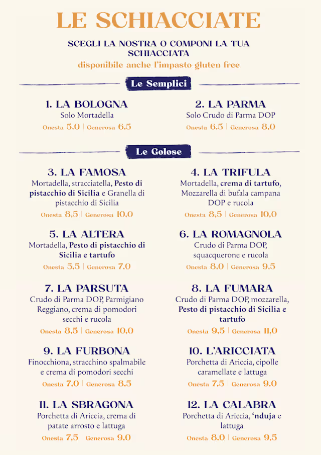 9/10Delish! The food was yummy, tasty, fresh, abundant, well prepared and nicely presented! Amongst all of us we tried 7 different schiacciata and they all ranged from good to great! The girl, who was alone with a place full of diners + take-outs + home delivery orders, did a stellar job at being as fast as she could while always remaining cheerful, polite, helpful and smiling! Thank you!
