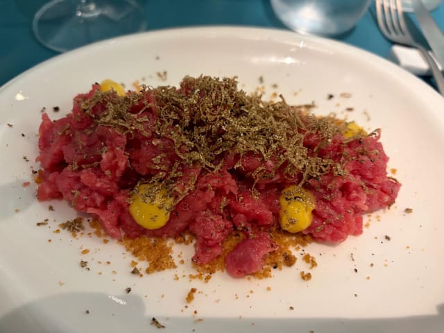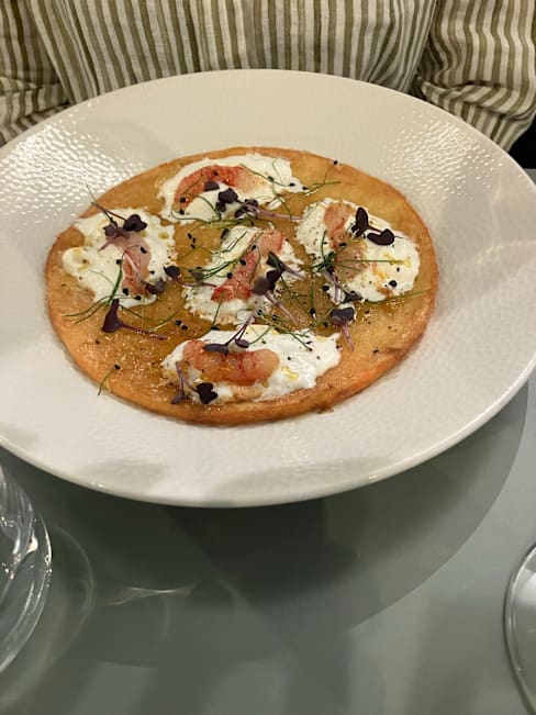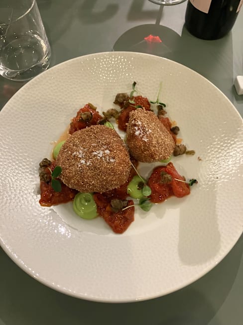 7/10Nice place - we were seated outside. Girls asked for spritzes as drinks which arrived quick but were v small in highball glasses and not wine glasses as expected. Starter/apps were v good and I order a half bottle of wine which was not chilled so was asked to wait - not a problem. The panzanella style gnocchi was v good as was the chickpea flatbread. Mains were ok - veal was served cold as intended but not what I expected at all - v similar to a charcuterie which was not what I wanted but tasted fine. Aubergine was the standout dish, beef was cooked well and the risotto was pretty good. Nothing was outstanding but still worth a visit.
